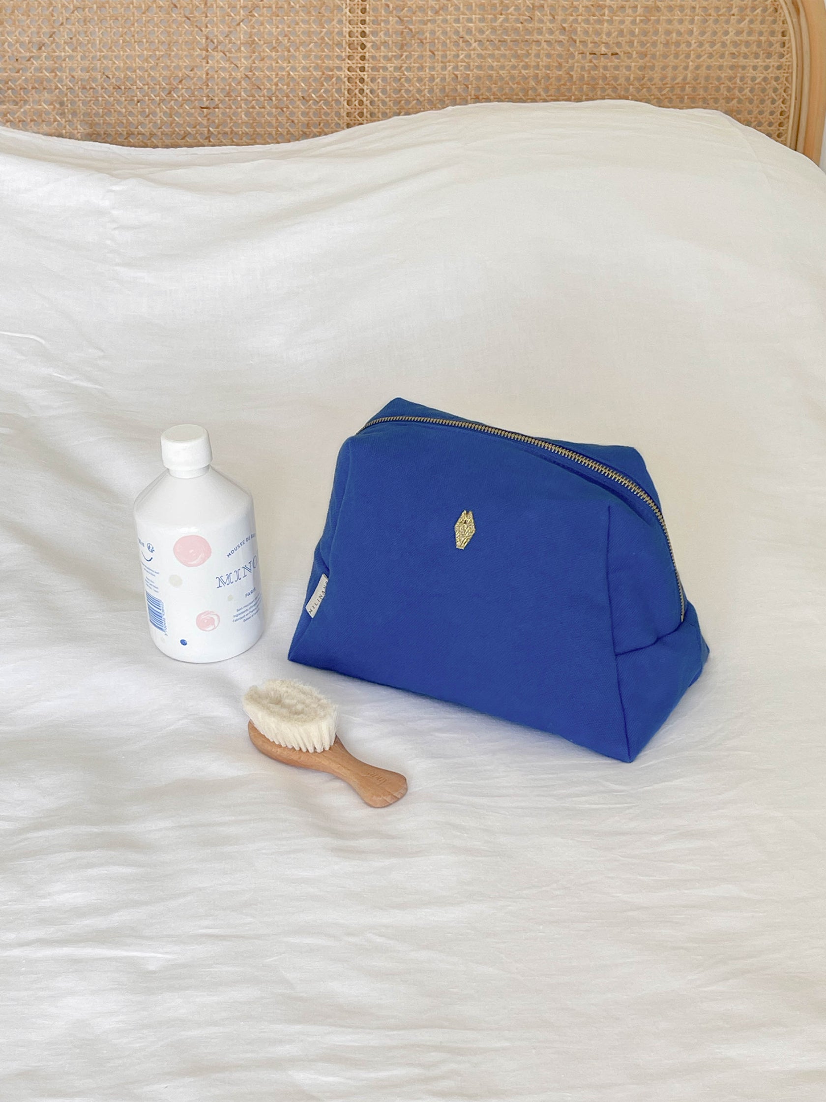 - Jolie trousse de toilette en polaire bleu cobalt avec une poche intérieure.