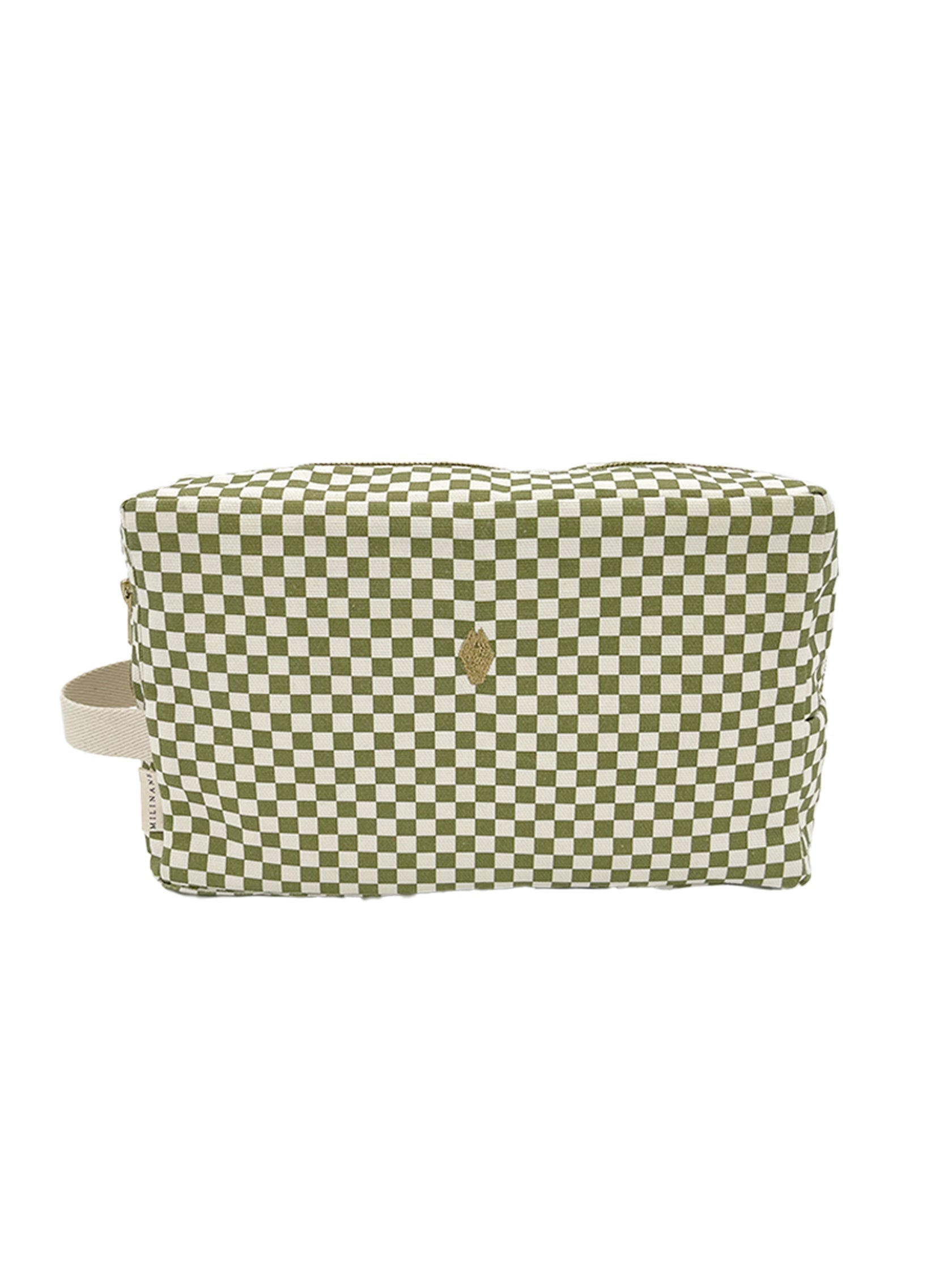 - Cette grande trousse de toilette Damier possède une poche intérieure et une large ouverture avec une fermeture éclair dorée.