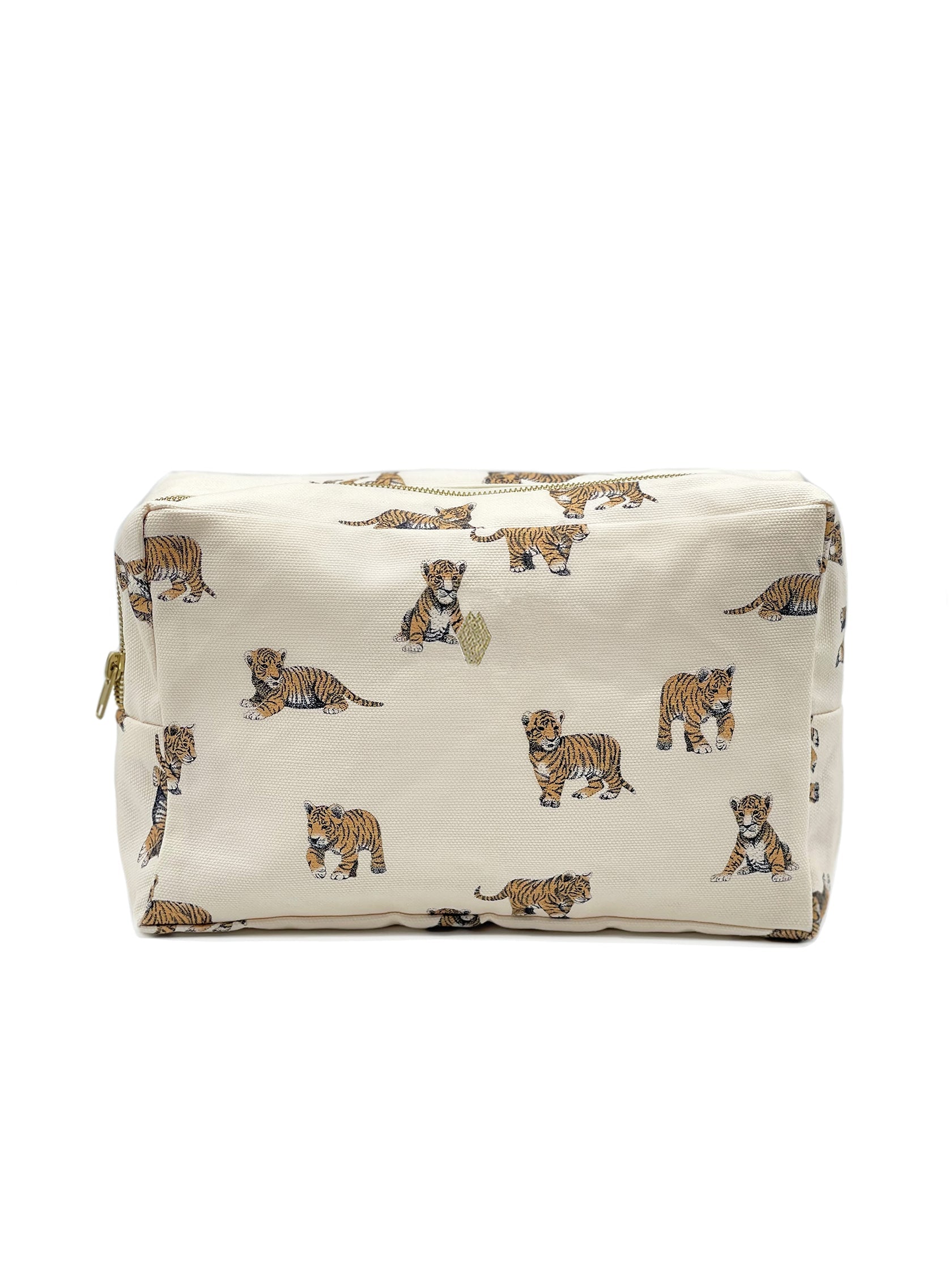 - Cette grande trousse de toilette Tiger possède une poche intérieure et une large ouverture avec une fermeture éclair dorée.