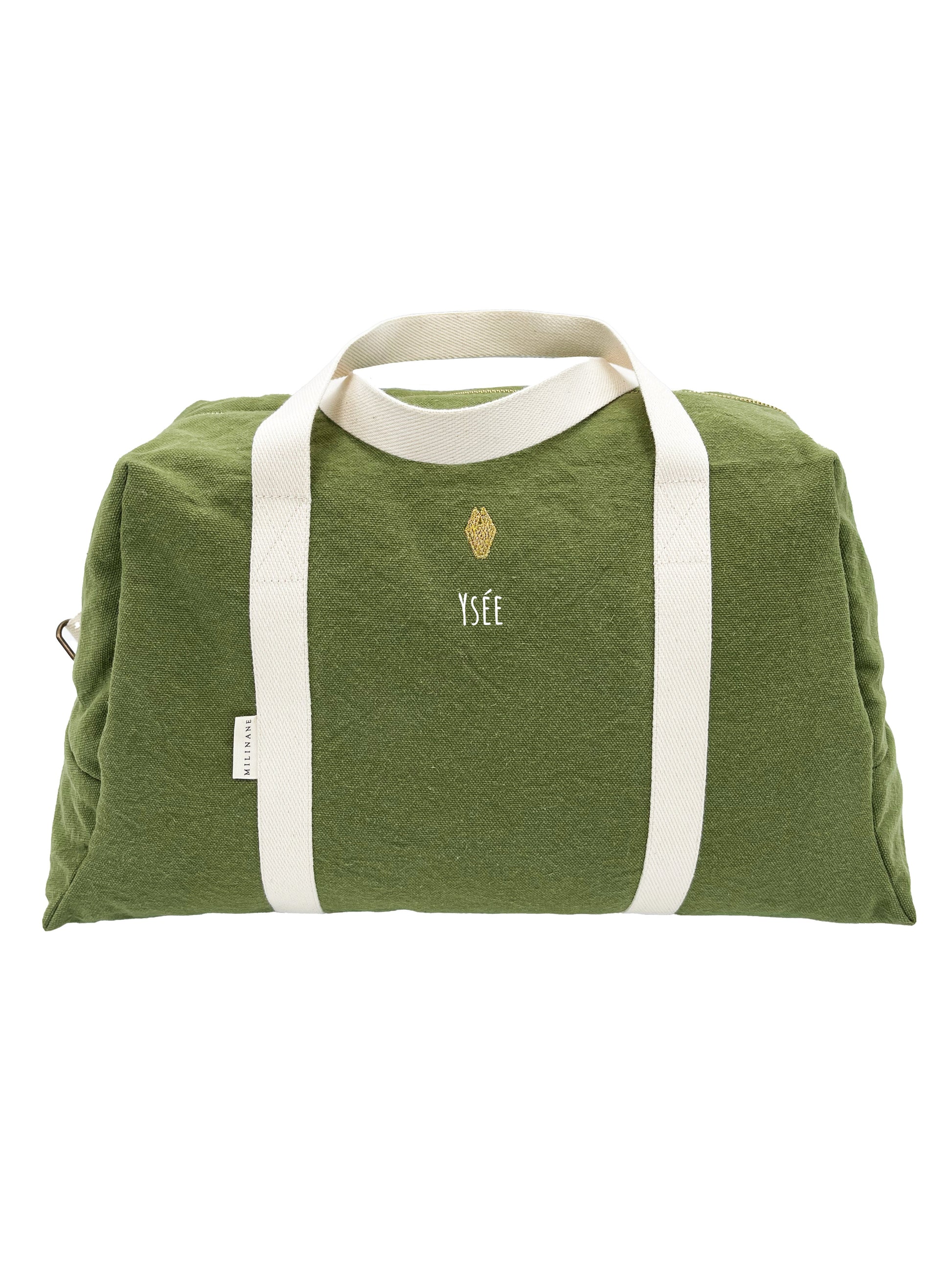 - Sac à langer olive en polaire avec une grande fermeture éclair dorée, 3 poches intérieures, 3 poignées dont une réglable