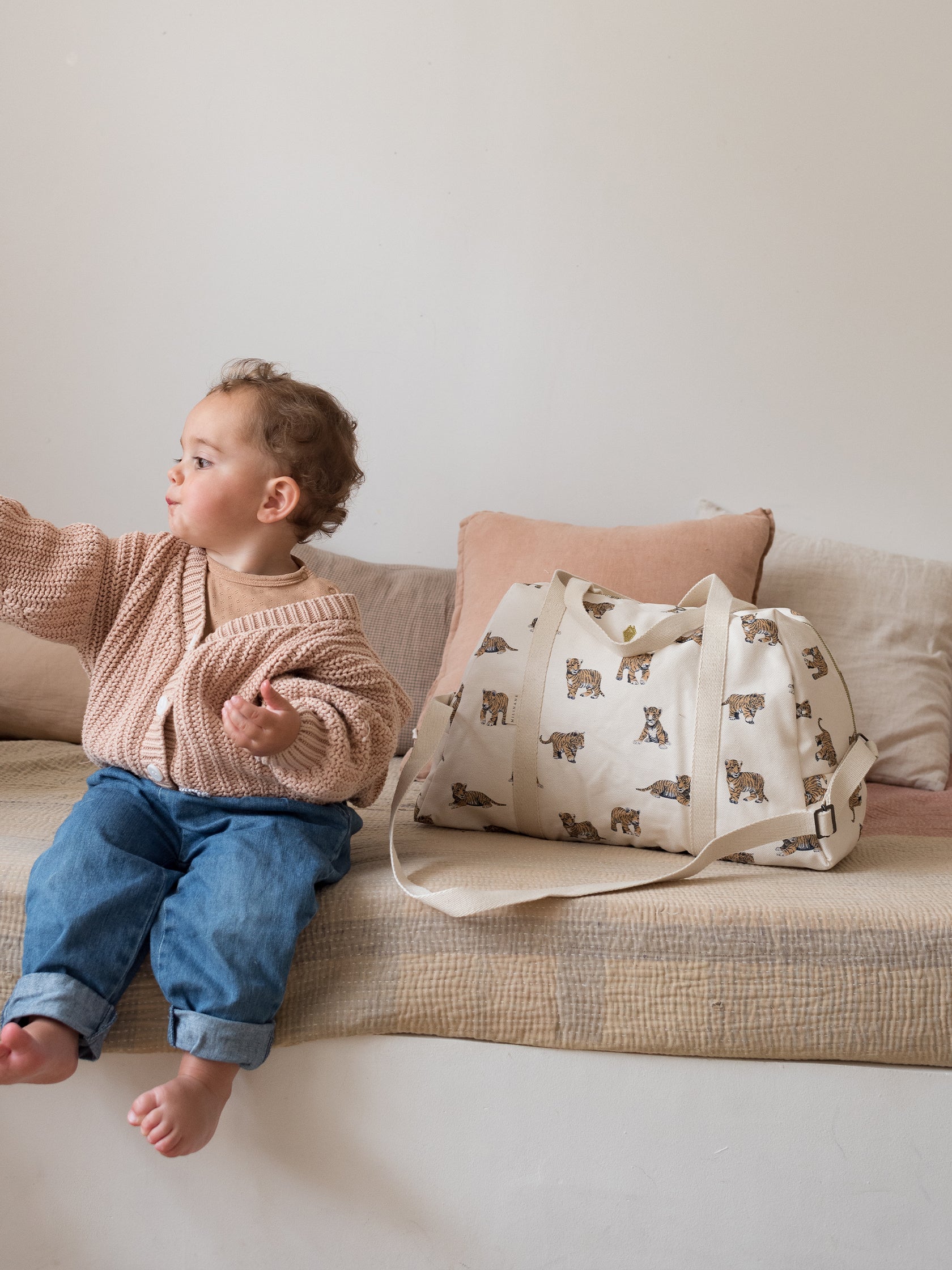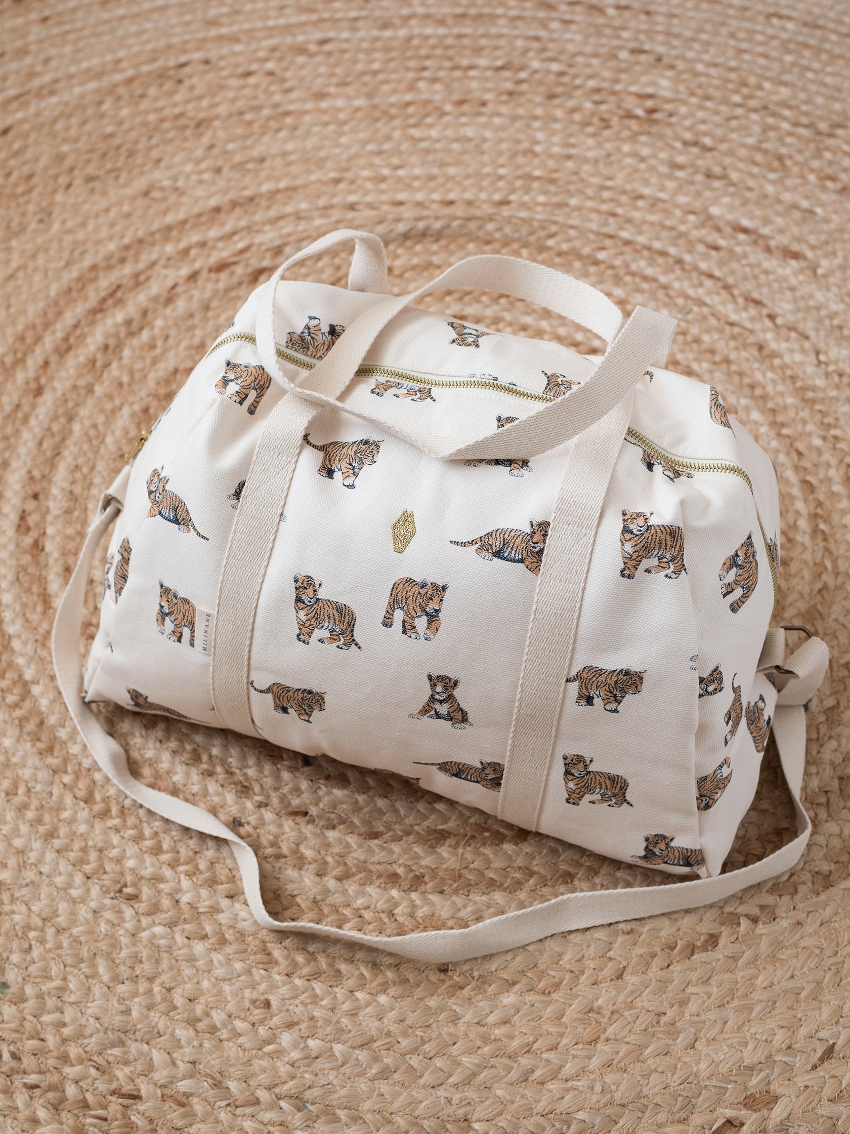 - Sac à langer Milk Tiger en polaire avec une grande fermeture éclair dorée, 3 poches intérieures, 3 poignées dont une réglable