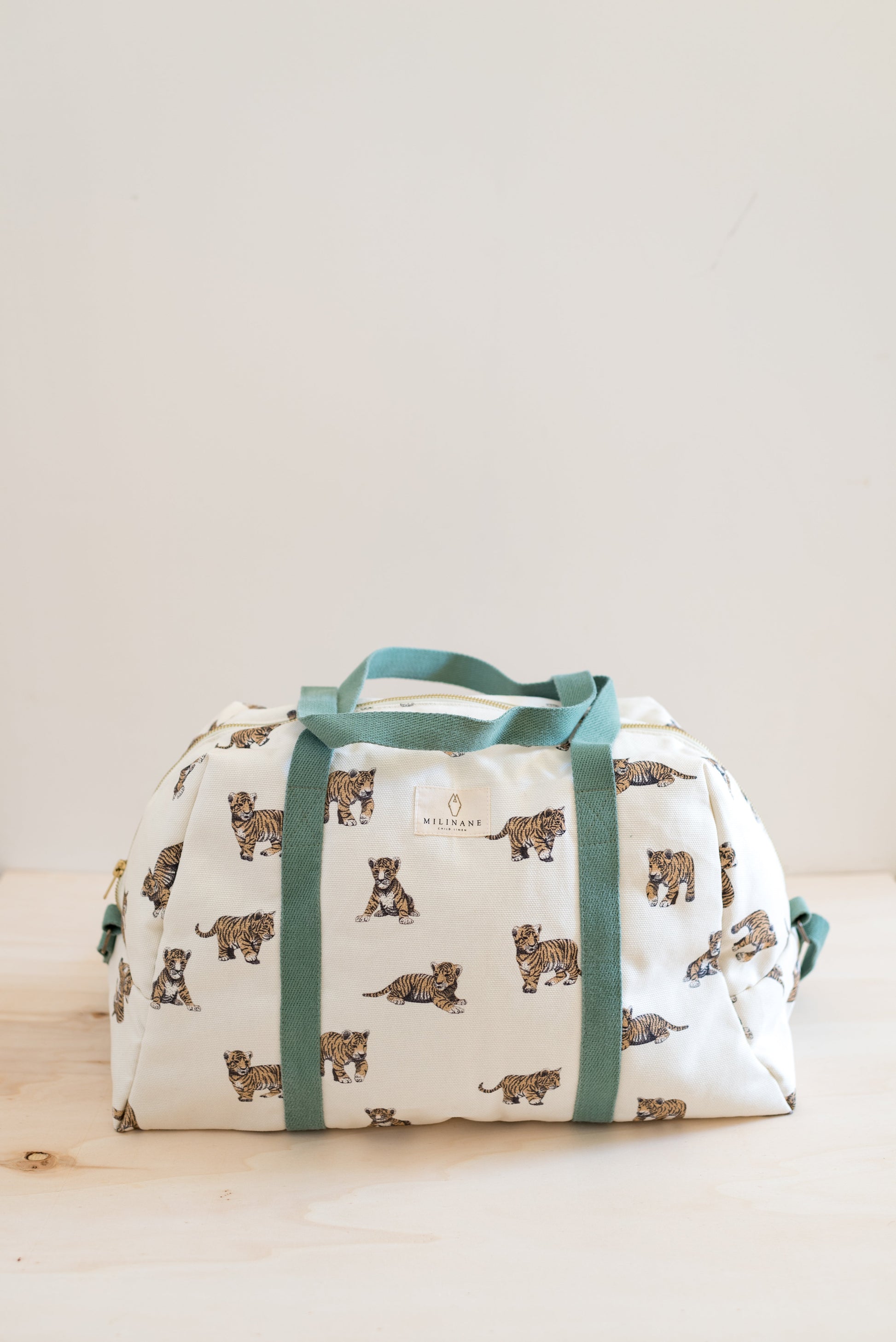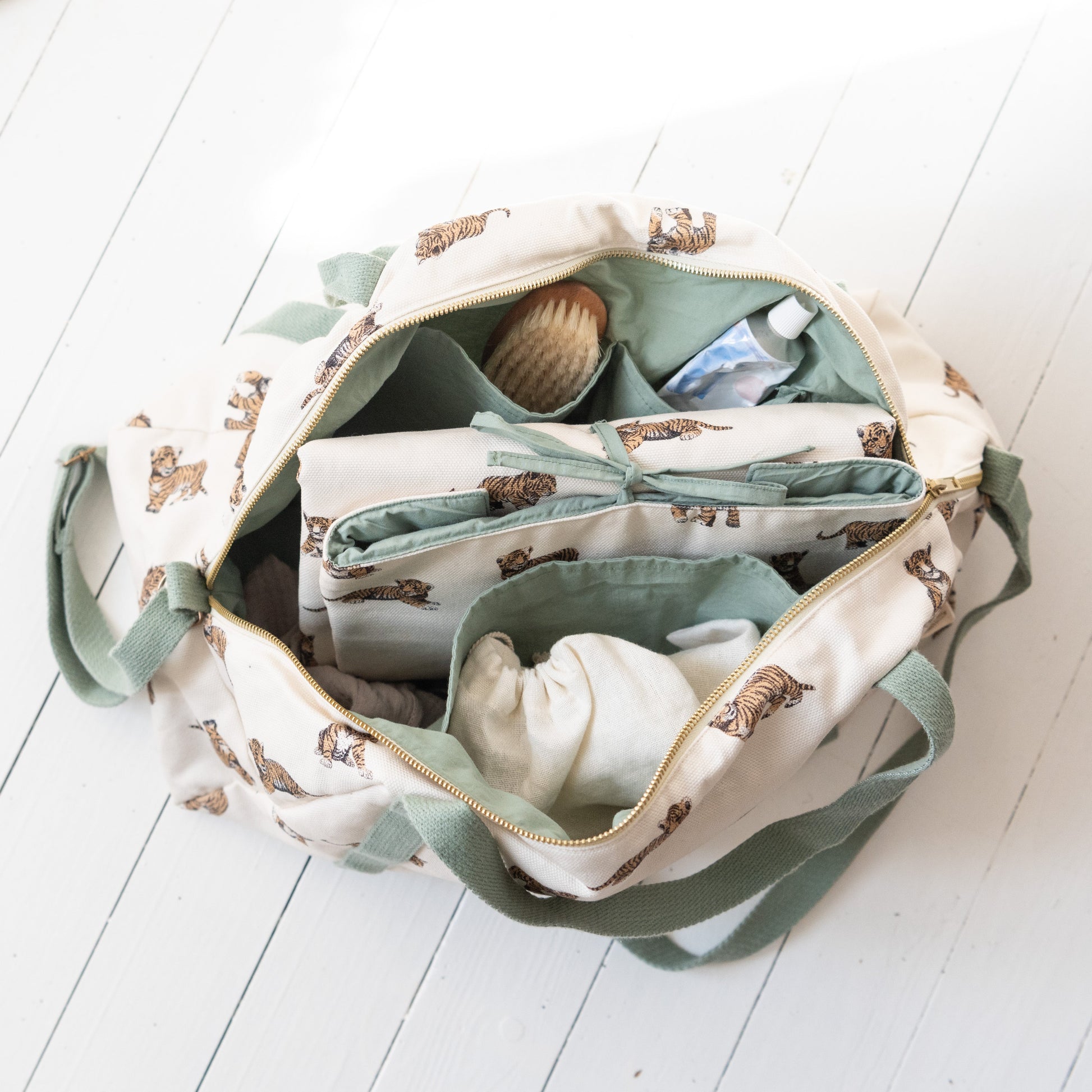 - Sac à langer Sage Tiger en polaire avec une grande fermeture éclair dorée, 3 poches intérieures, 3 poignées dont une réglable